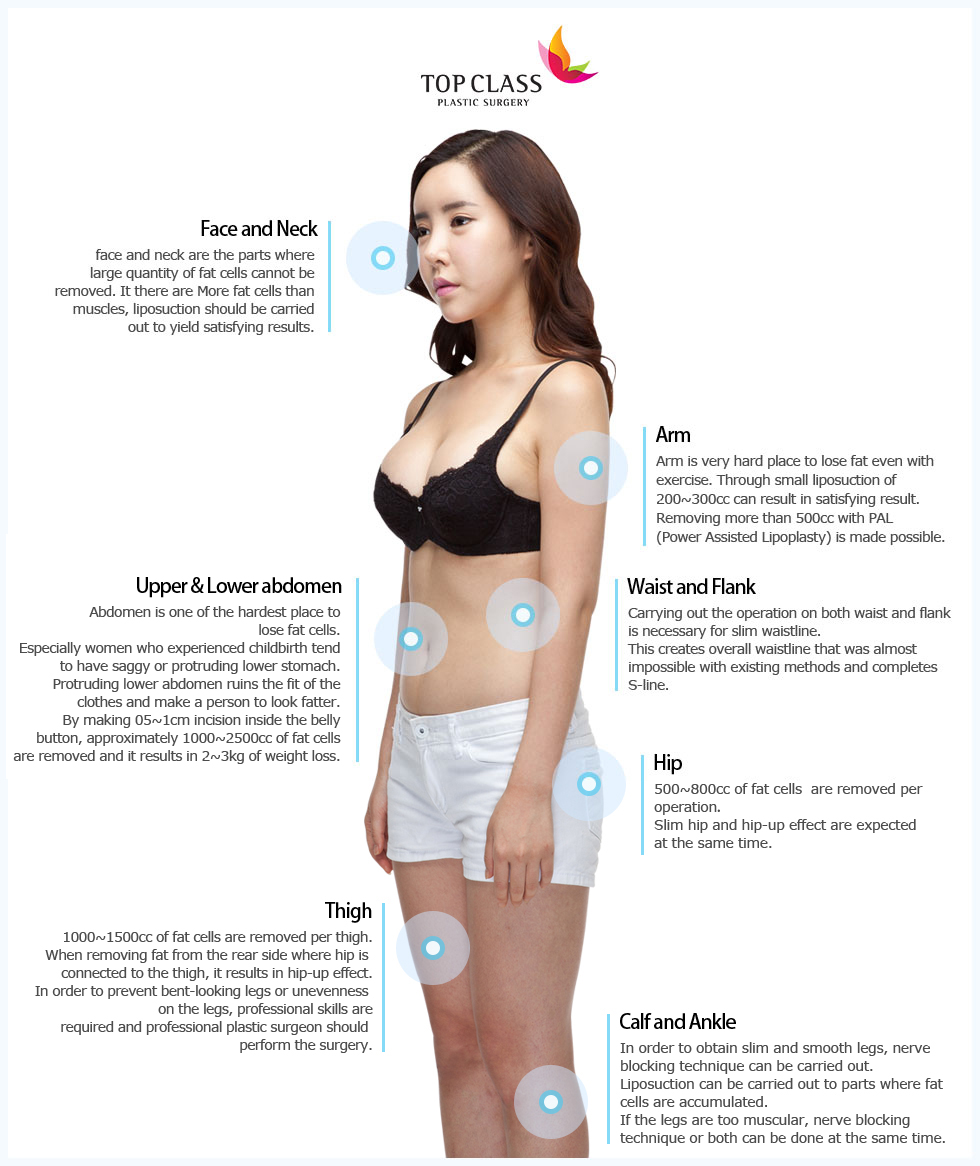 It makes it possible to remove fat from lower stomach, hip, thigh, atnd arms selectively in short period of time. Most importantly, liposuction is removal of fat cells that can reduce the number of fat cells permanently to minimize the side effects (yo-yo effect) compared to exercise or diet that simply reduces the size of the cells.Reduction of fat cells continues until 3 months after liposuction procedure and no fat will accumulate where liposuction is carried out. However, too much liposuction can make the skin uneven and sag. Generally 3000-5000cc of fat cells are removed and the amount differs by different parts of the body.