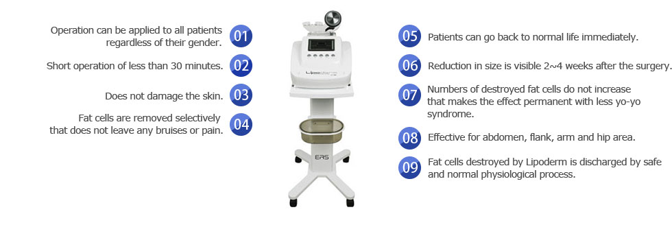 Reduction in size is obtained within 2~4 weeks after surgery. It is especially effective on abdomen, flank, arm and hip area where there are substantial amount of subcutaneous fat cells due to destruction of fat cells by cavitation.